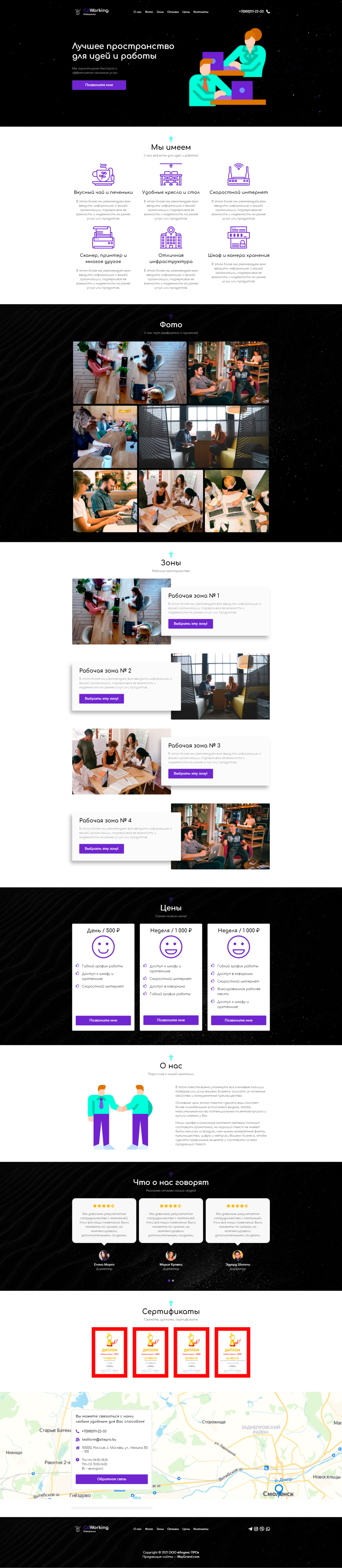 - Промоблок "Лучшее пространство для идей и работы" с кнопкой призыва к действию "Позвоните мне"